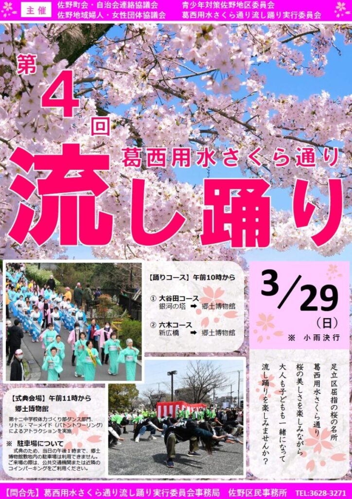 足立区大谷田にある葛西用水沿いの美しい桜並木(約290本のソメイヨシノ)を背景に、華やかな踊りが披露されます。