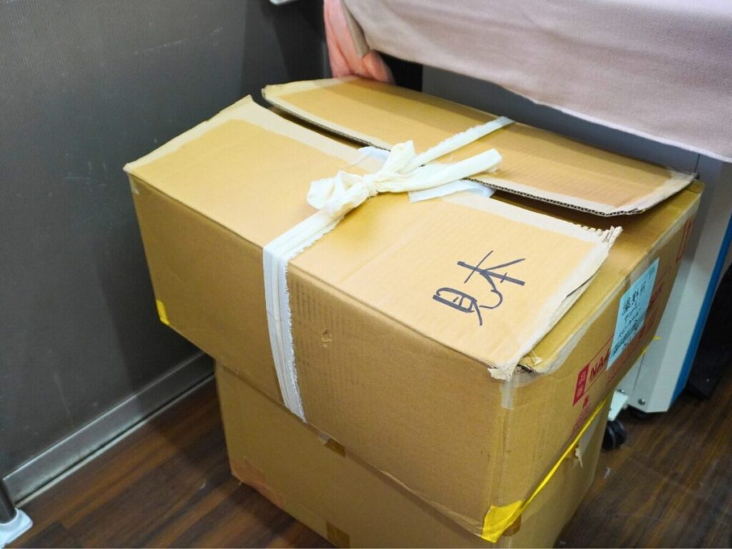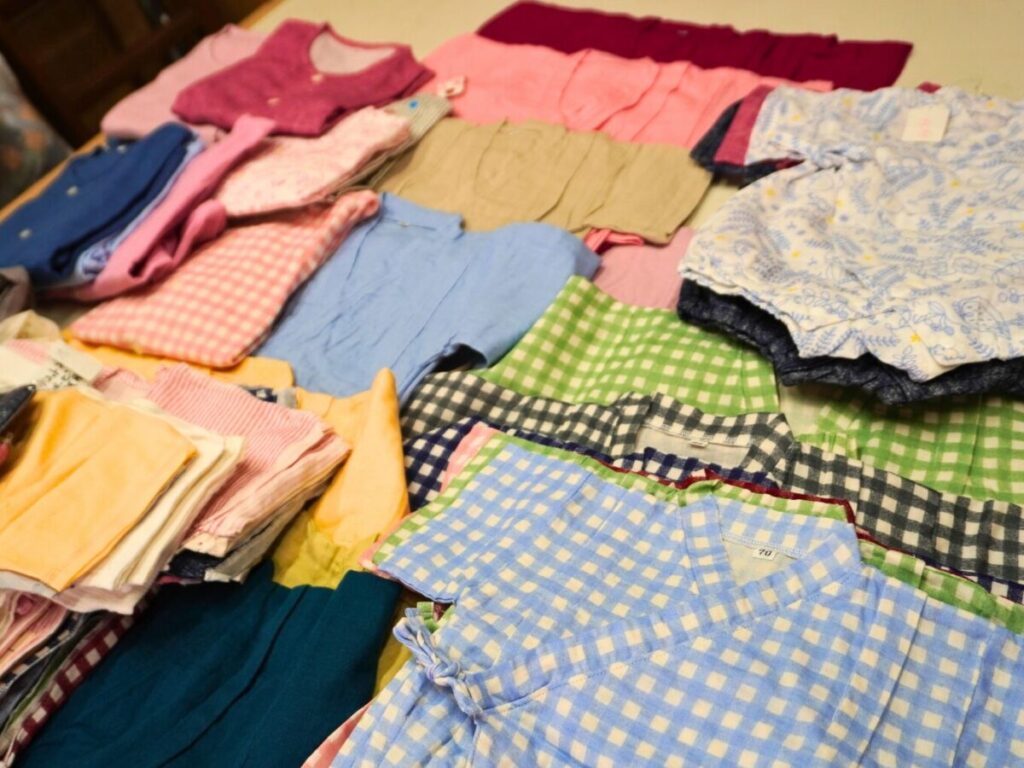 「見本品」と書かれた箱の中から出てきたのは、ガーゼ製品の数々。赤ちゃん用肌着やキッズパジャマ、バスタオル、クッションカバー、ガーゼマフラーなど。子供から大人まで使える幅広いアイテムが詰まっていました。