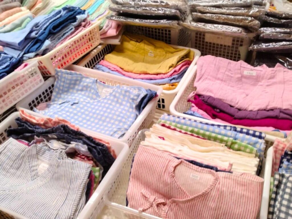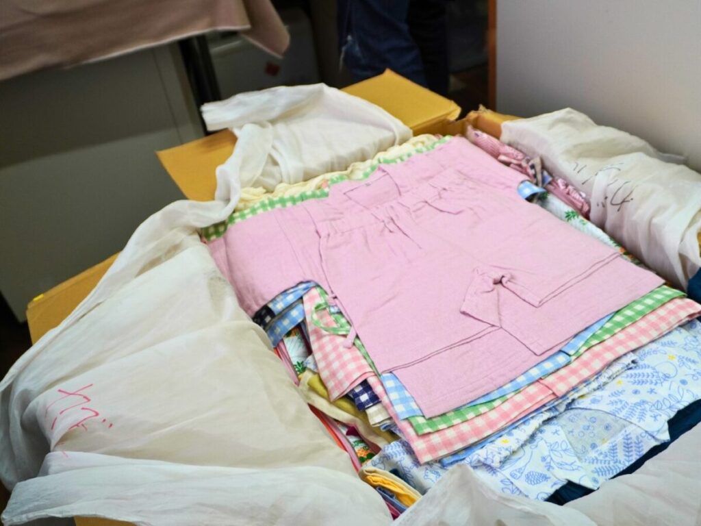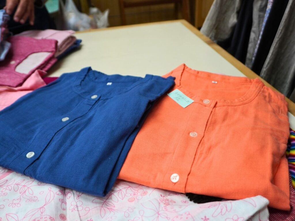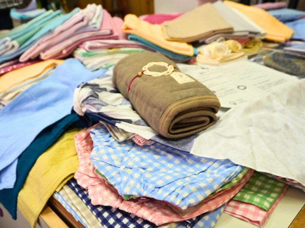 今回販売されるのは、この1〜2年、足立区内のイベントや展示会・撮影で使われてきたサンプル品です。一度も着用はしていませんが、カズスタイルのガーゼ製品の良さを伝えるために一度水洗いをしたものです。洗った後の肌触りの良さを知ってほしい、というこだわりから。いつもは洗う前の新品を販売していますが、今回のセールではリアルな使用感が確認できます。
