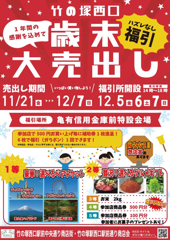 竹の塚西口駅前中央通り商店街・竹の塚駅西口駅前通り商店会で、2025年11月21日(金)から歳末大売出しが始まります。