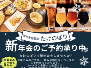 今年5月のリニューアル以降、100種類を超える豊富なメニューやクラフトビールが揃うアットホームな居酒屋として親しまれてきた「隠れ家居酒屋たけのぼり」で、今年はカウントダウンイベントを開催するそうです。