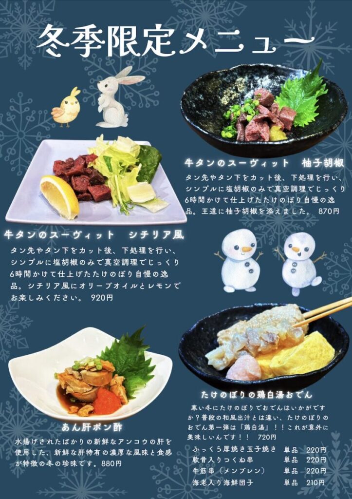 たけのぼりでは季節のアラカルトメニューも展開中。現在では冬限定メニューとして牛タンのスーヴィット(シチリア風)、あん肝ポン酢、たけのぼりの鶏白湯おでんなどが楽しめます。