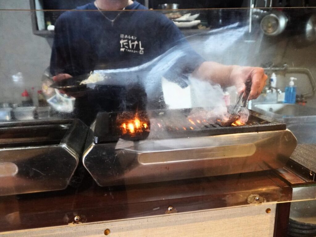 3店舗目となる竹の塚店は、綾瀬・亀有にはない斬新なスタイルで営業しています。それは、お客が自分で焼かない焼肉店。店内中央にあるロースターで、綾瀬店にいた焼肉のプロが焼いてくれるというのです。