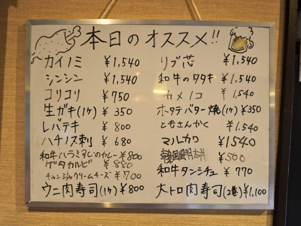 本日のおすすめメニューもあり、焼肉以外に海鮮系のおつまみなどもありました。訪れるたびに新しい出会いがありそうです。