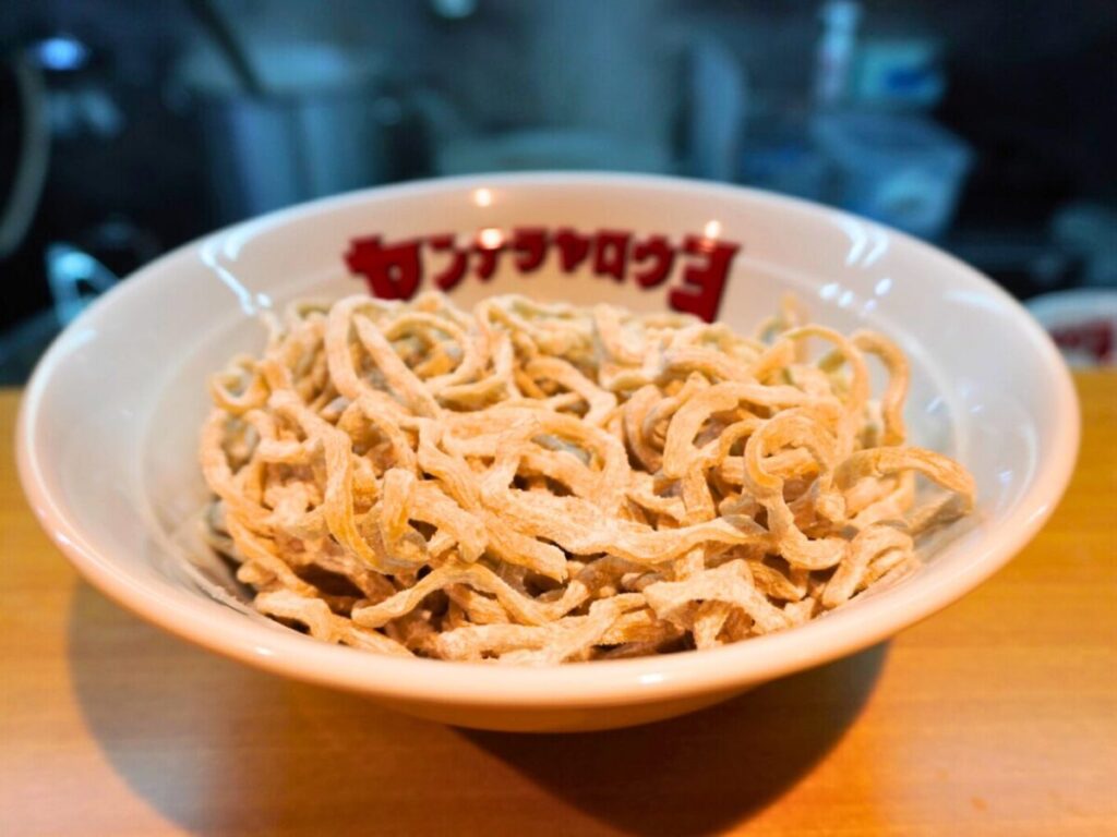 粉には二郎系でおなじみという、「オーション」を使用。小麦粉と”かんすい”のバランスがとても大切で、その日の湿度によって水分量を調整するなど、毎日が真剣勝負だそうです。ヤンナラヤロウヨの麺は、小麦感が強めの配合になっているとのこと。