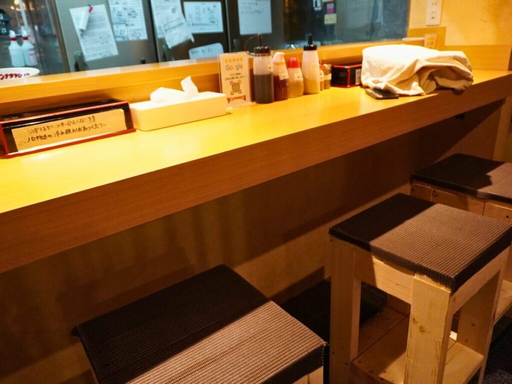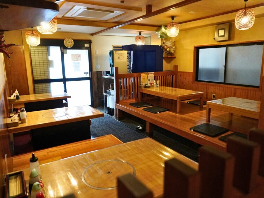 店内は明るい木目の内装で、カウンター席のほかにテーブル席、さらに小上がりのお座敷席もあります。