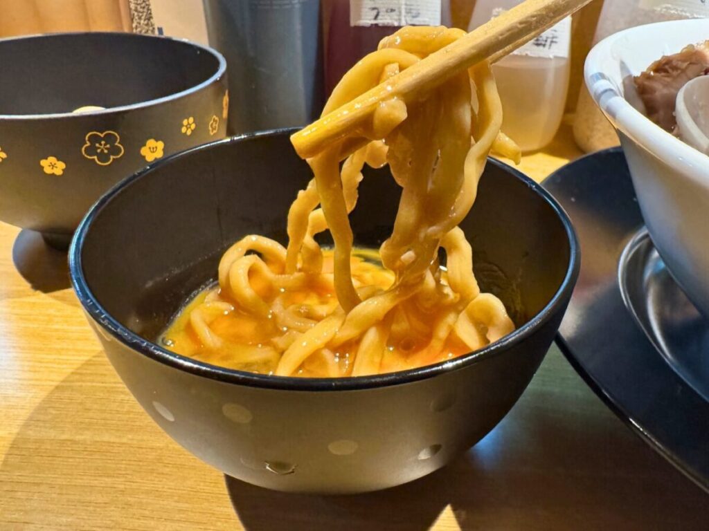 太めの麺はモチモチで、小麦の香りがしっかり。小なので150g、一般的なお店の1.5倍の量です。