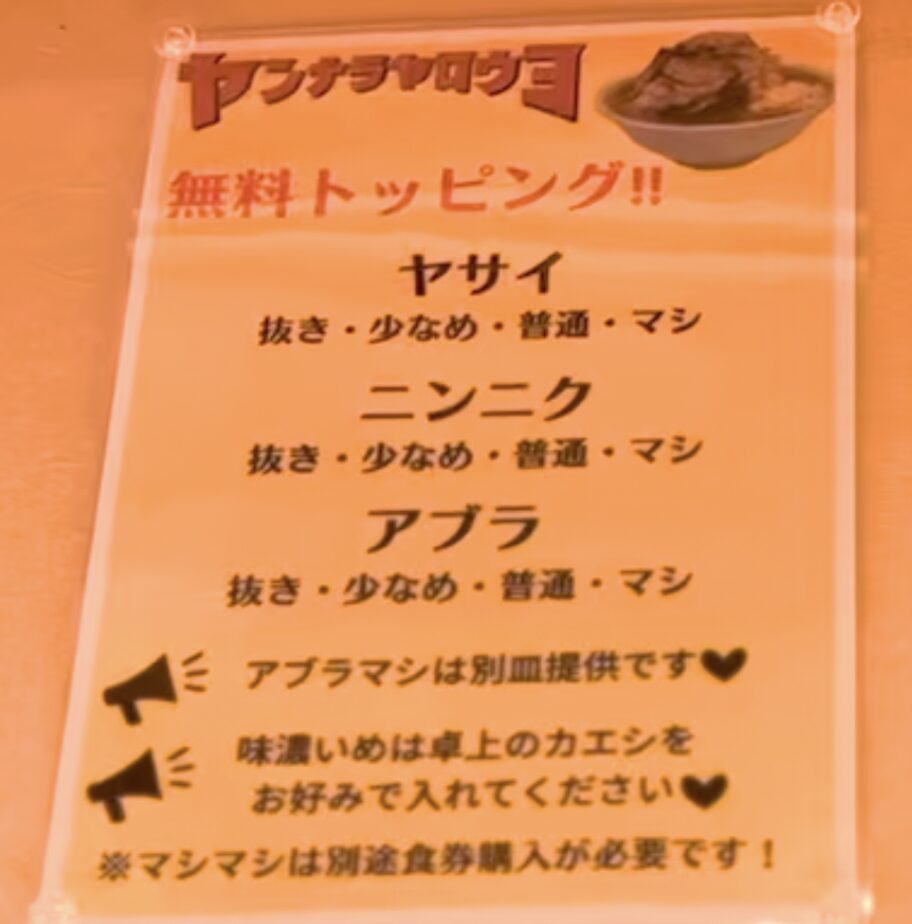 そして二郎系といえば「野菜」「ニンニク」「アブラ」。抜き・少なめ・普通・マシまで無料で選べます。別途食券(100円)を購入することで、「マシマシ」も選べます。