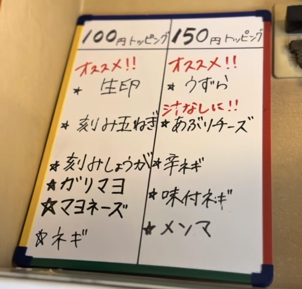 トッピングもさまざま。訪れた日には、100円トッピングには生卵、刻み玉ねぎ、刻みしょうが、ガリマヨ、マヨネーズ、ネギ。150円トッピングにはうずら、あぶりチーズ、辛ネギ、味付ネギ、メンマがありました。今後も新しいトッピングが増えていくとのこと。