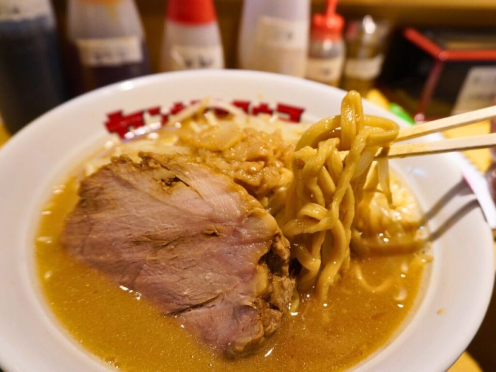 生卵に絡めて食べると、まろやかで優しい味に変化します。二郎系初心者で「アブラはちょっと…」という方にも、この食べ方はとてもおすすめです。トッピングで迷ったら、まずは生卵をおすすめしたいです。
