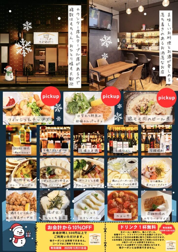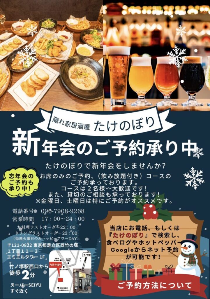 竹ノ塚駅西口、西友のあるエミエルタワー1階にある「隠れ家居酒屋たけのぼり」で、忘年会・新年会に向けた冬のコースメニューが公開されました!