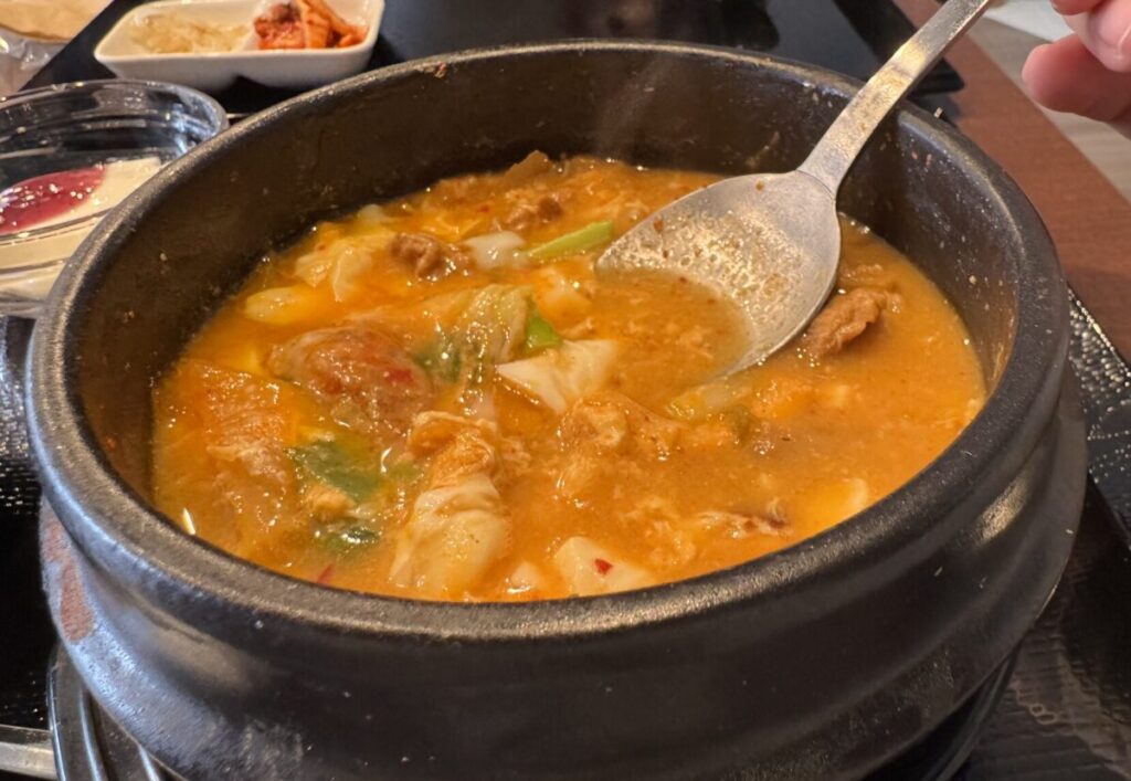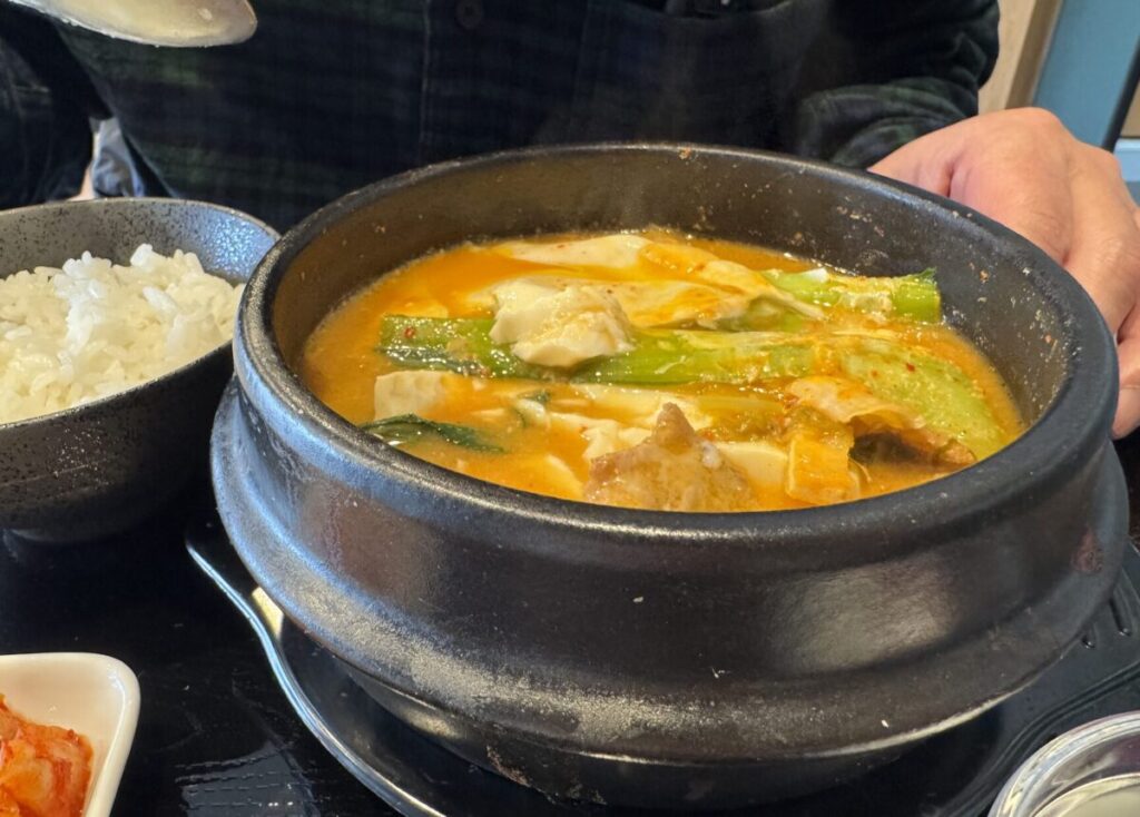 スンドゥブは、牛すじ・チーズ明太子・豚キムチの3種類あり、初回なので定番の豚キムチを選びました。この日は私たちの他に4名のお客さんがいましたが、全員が豚キムチスンドゥブを注文していました。