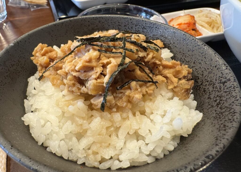 今回は+150円でライスから鶏そぼろ丼に変更してみました。ビビン麺の辛さをやさしい甘みが受け止めてくれます。