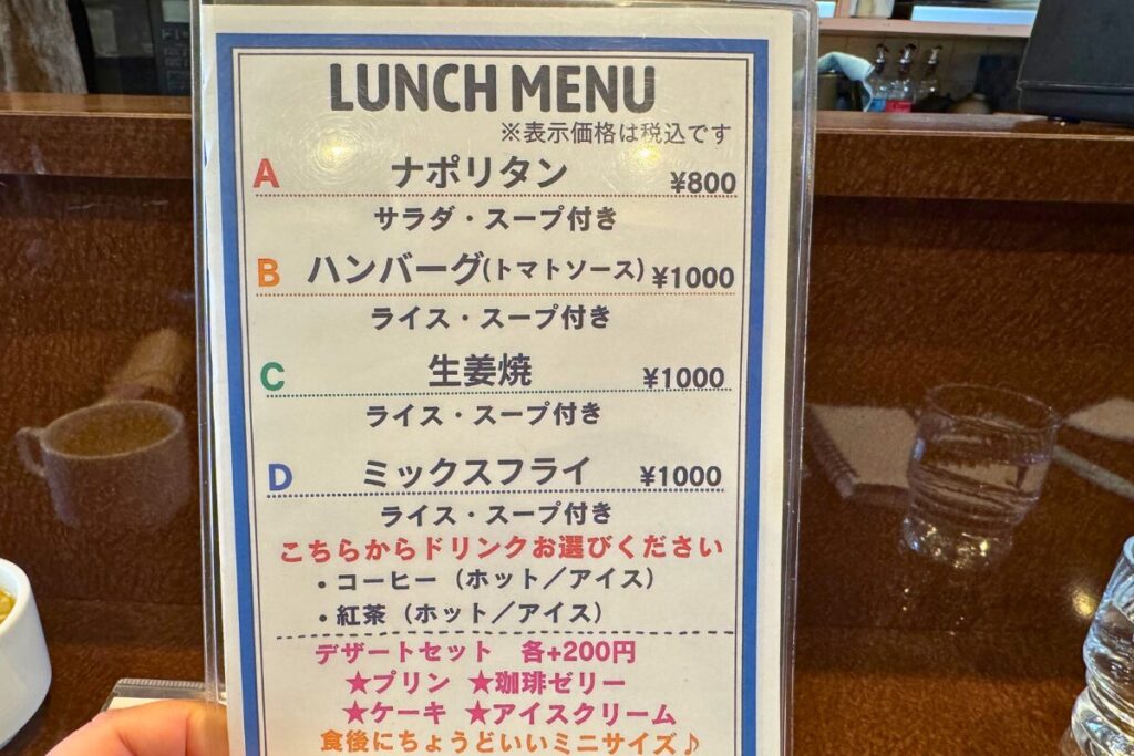 ナポリタンのランチも人気だそうです。たけトピの読者さんからも、おすすめメニューとして教えていただいていました。コーヒーや紅茶がセットになっているのも嬉しいポイントです。