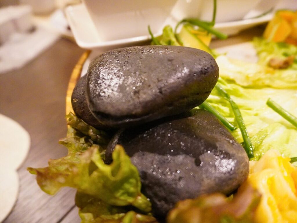 石焼羊肉はモンゴルの伝統的な家庭料理です。食べ物と一緒に石が盛り付けられていました。