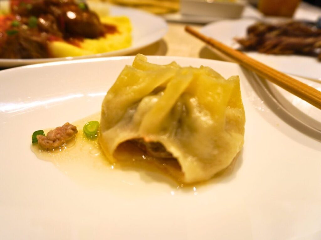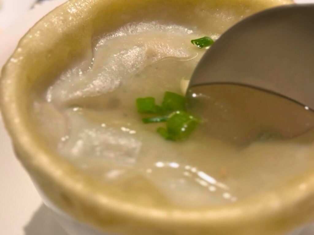 スプーンを割り入れると、ほかほかのスープが広がります。お肉の出汁を感じる、シンプルですっきりとした味わいでした。