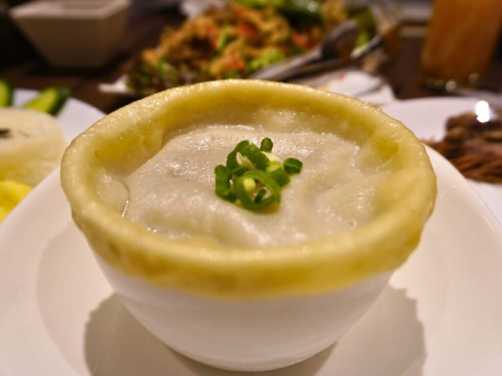 器に餃子の皮のようなものが覆われている「シムスープ」。