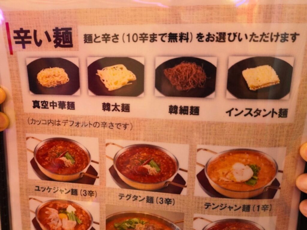 韓韓麺名物とも言える辛い麺。麺の種類は真空中華麺・韓太麺・韓細麺・インスタント麺の4種類から選べ、10辛まで無料です。