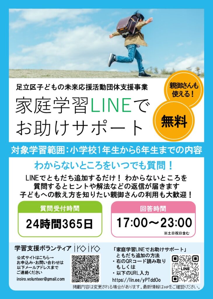 子どもたちの学びに寄り添いたいという思いで活動する学習支援ボランティアiroiroより、「家庭学習LINEでお助けサポート」についてご連絡をいただきました。