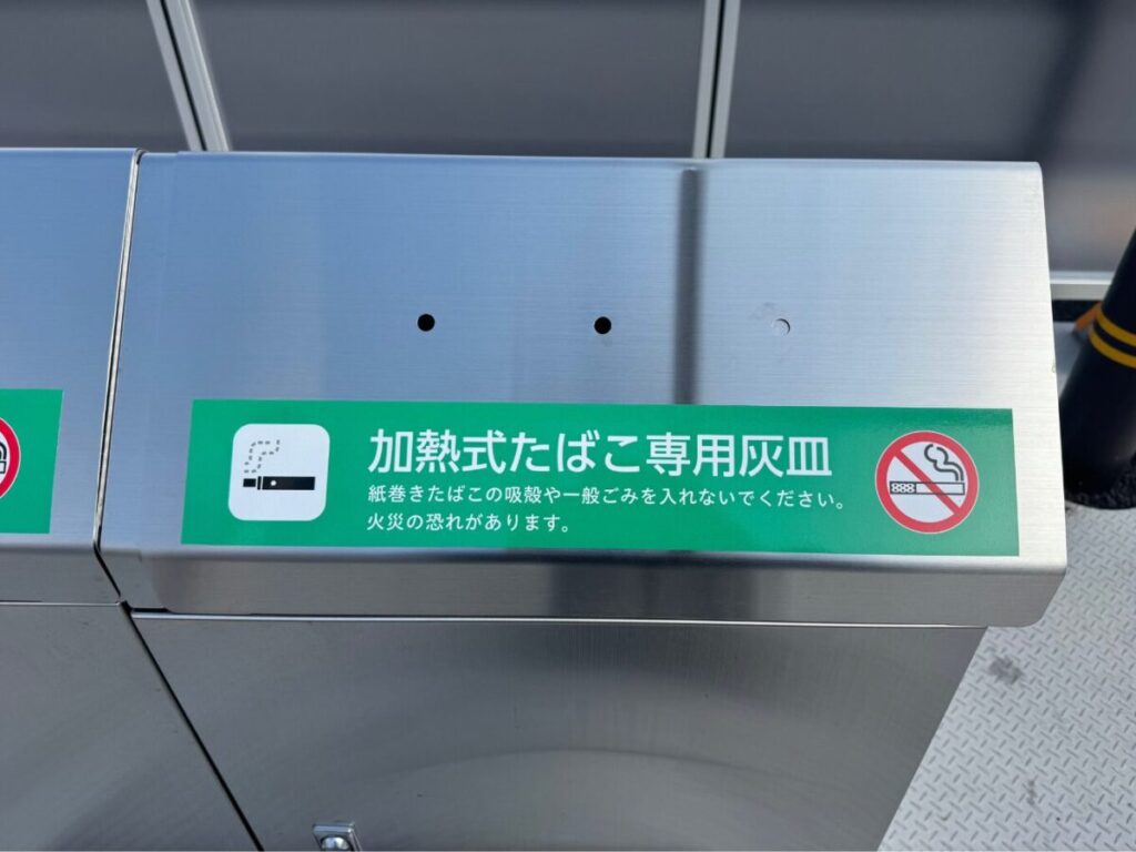 この公衆喫煙所は、加熱式たばこ専用です。「紙巻きたばこを使用される場合は、竹ノ塚駅東口の公衆喫煙所をご利用ください」と注意書きがありました。