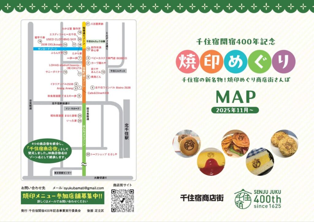 千住宿商店街の23店舗が参加する特別な焼印メニューも11月2日から開始です。