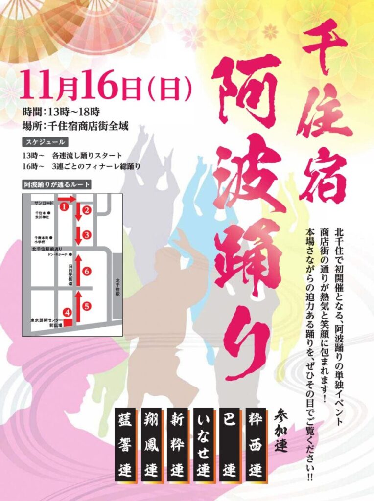 11/16(日)13:00〜16:00には、千住宿阿波踊りを開催予定とのことです。