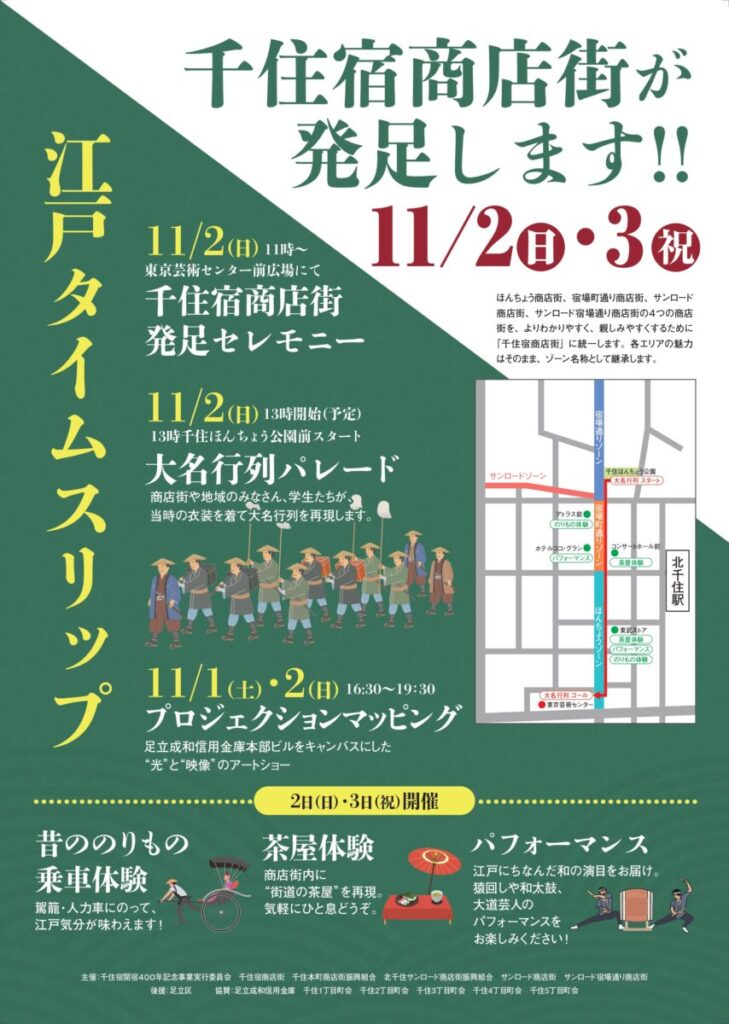 11/2・3には、千住宿商店街発足セレモニーとして様々なイベントが開催されます。
