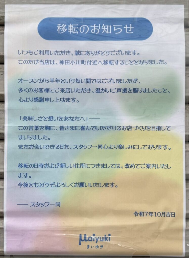 ふわふわの練乳ミルクかき氷やワッフルが楽しめるお店でしたが、10月に入ってお店が閉まっているとの情報を読者さんからいただき、現地を確認したところ、店頭に「神田小川町付近へ移転します」との貼り紙が掲示されていました。