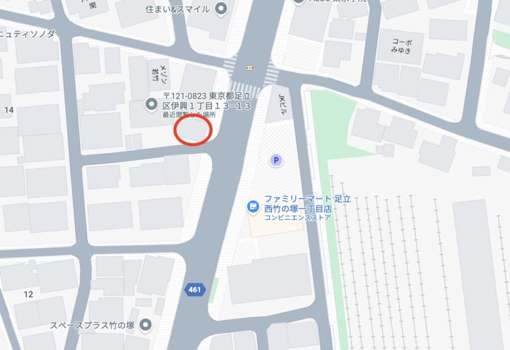 お店がオープンするのは足立区伊興1丁目13-13 2階。下のマップの赤い丸で囲んでいる場所す。尾竹橋通り沿い、ファミリーマート足立西竹の塚一丁目店の向かいで、竹ノ塚駅からは徒歩約10分くらいの場所にあります。