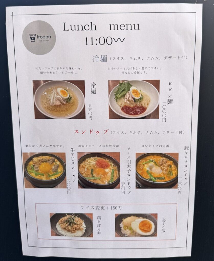 カフェのランチメニューといえば、パスタやカレー、サンドイッチなどが思い浮かぶのですが、tea coffee Irodoriさんでは冷麺、ビビン麺、スンドゥブがいただけるというのです。
