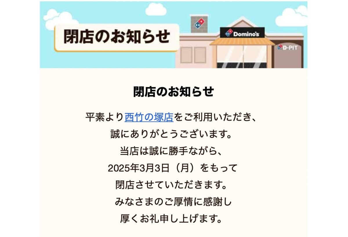 西竹の塚1丁目にあるドミノ・ピザ西竹の塚店が2025年3月2日に閉店することがわかりました。 ドミノ・ピザ西竹の塚店閉店のお知らせ 最初の閉店のお知らせメールは3月3日と…