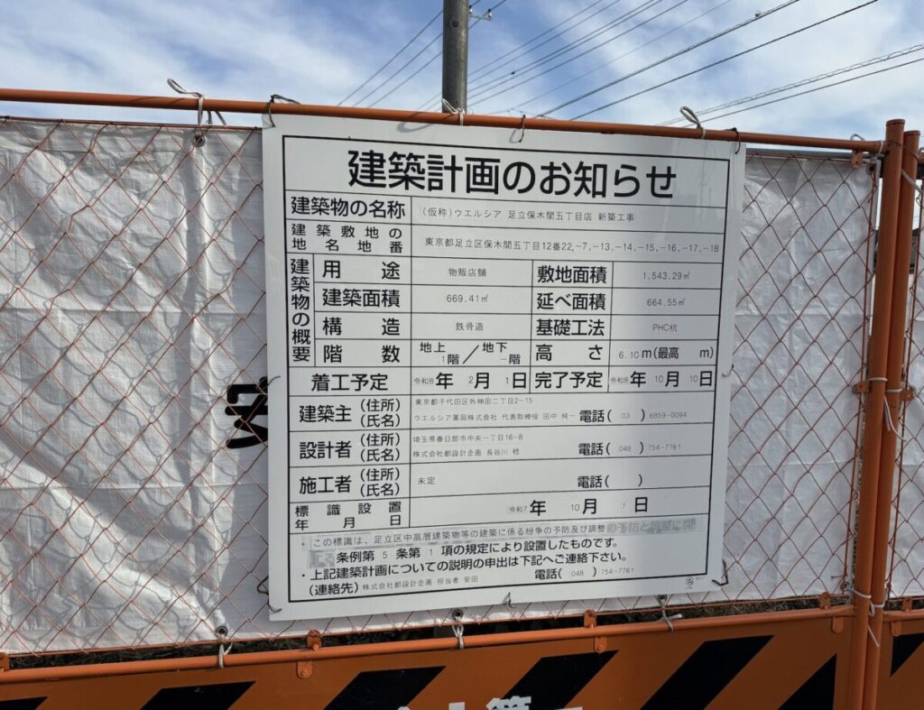 保木間5丁目に「(仮称)ウエルシア足立保木間5丁目店 新築工事」という建築計画が出ていました。