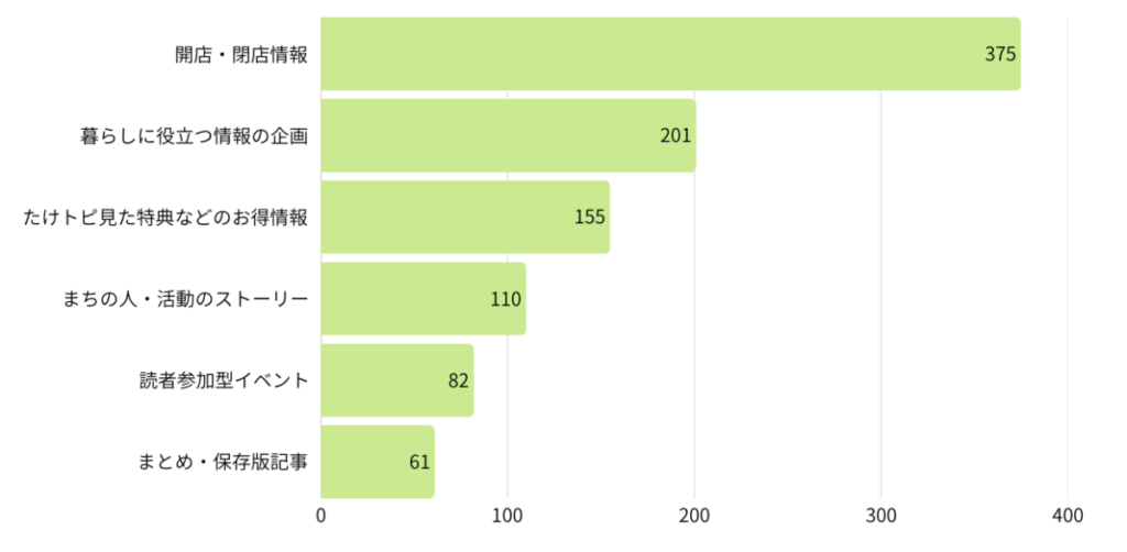 開店・閉店情報が多く、次いで暮らしに役立つ情報を知りたい、という人が多い結果となりました。