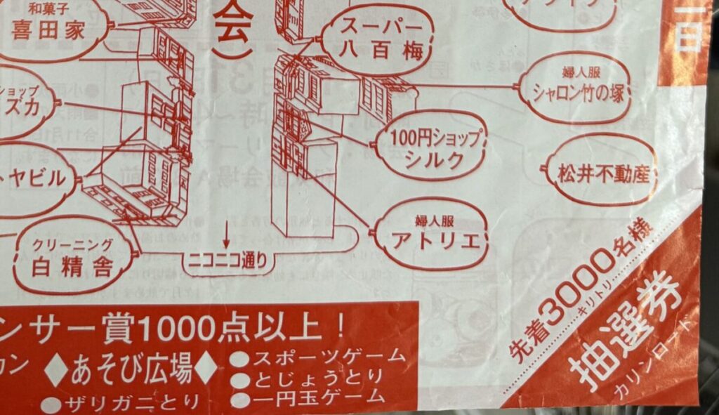 赤と白のチラシに掲載されていたのは、当時の商店街のマップと、思わずびっくりしてしまった景品でした。当時の商店街の賑わいや時代の空気が感じられます。