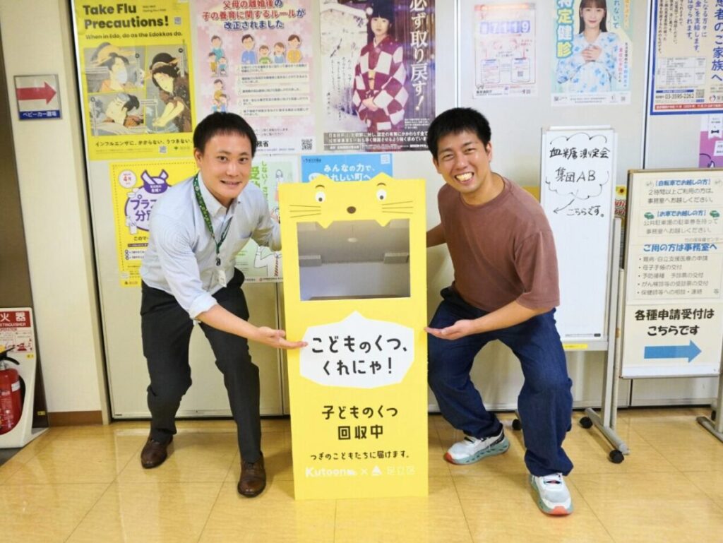 このプロジェクトは、足立区と子どもの靴のサブスク「Kutoon(クトゥーン)」を運営する株式会社SlowFastが協力して行っているものです。2025年10月10日、足立区政策経営部の山﨑悠生さんとSlowFast代表の谷口昌優さんが、区内6か所を回りながら回収ボックスを設置していましたので詳しくお話を伺いました。