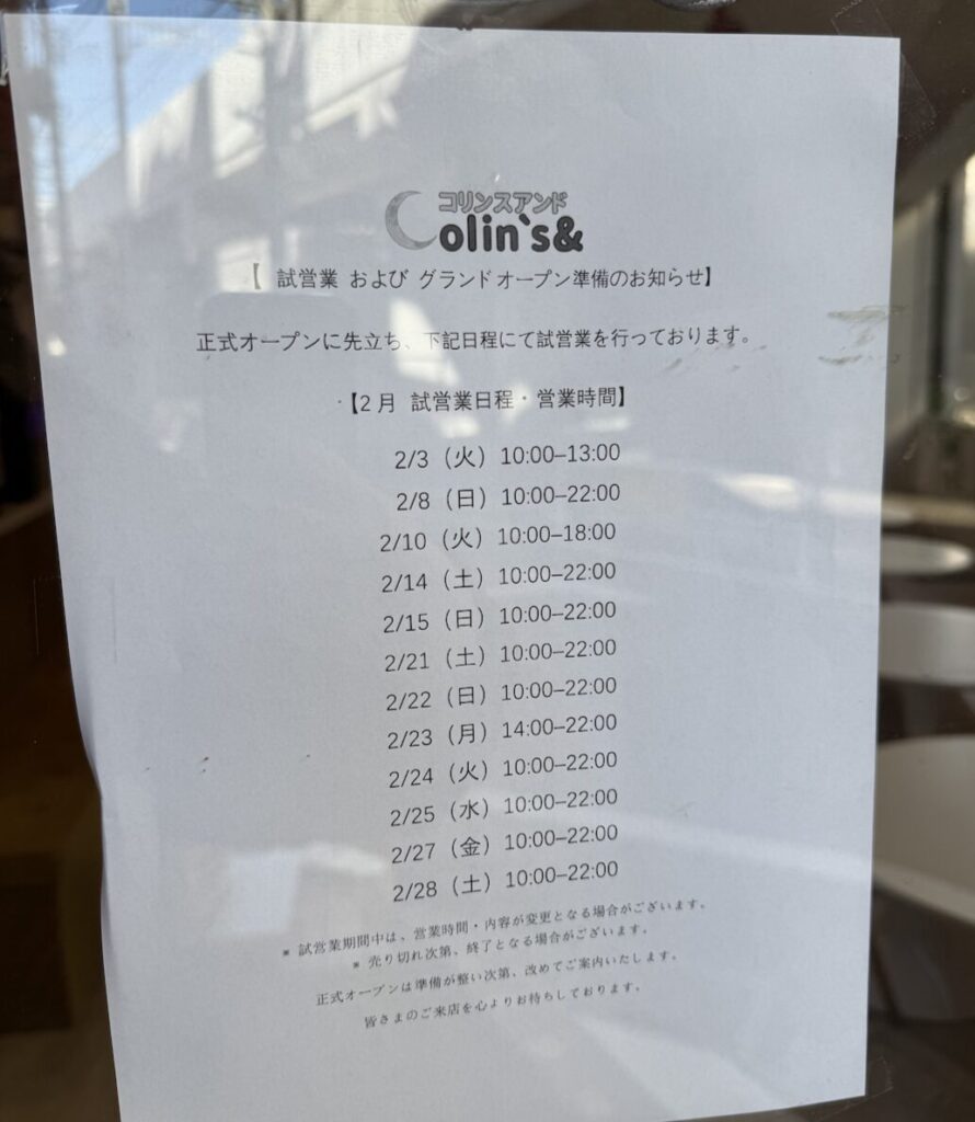 お店の前を通りかかったところ、2月中は試験営業が行われていることがわかりました。