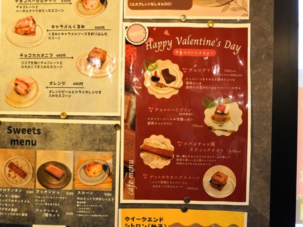 ドバイチョコ風スティックタルトのほかにも、チョコテリーヌ、チョコレートプリン、チョコカカオニブスコーンなど、チョコレートメニューが充実していました。2月中にもう一度ゆっくり訪れたいと思います。