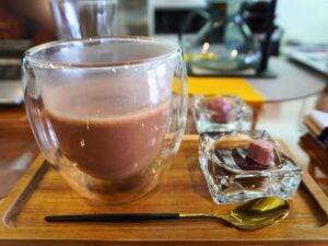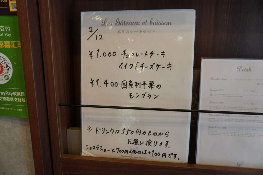 ここでは、飲み物やケーキを店内で楽しめます。お得な本日のケーキセットも良かったのですが、ケーキのラインナップを眺めていて気になった、ハート型の「ショコラアールグレイ」と、ホットチョコレートの「ショコラショーグアナラ」をいただきました。