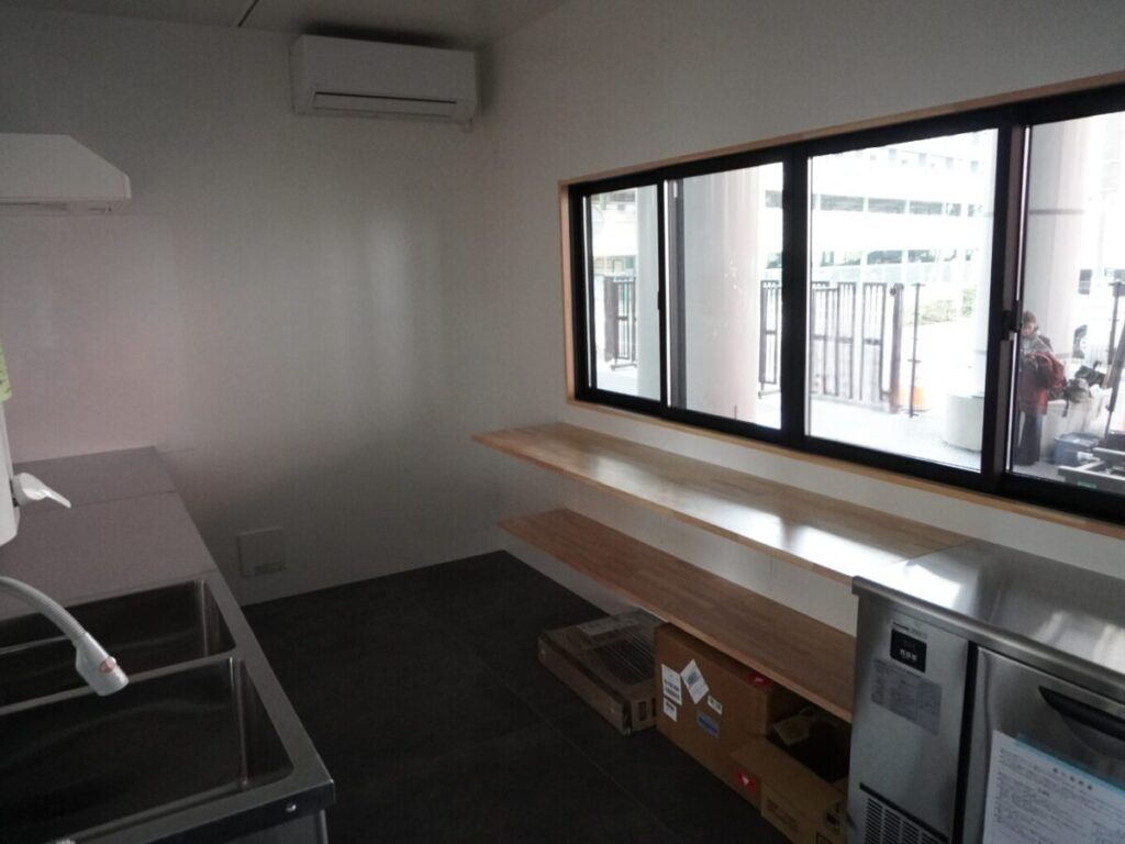 キッチントレーラーの中はこのような感じです。ここに冷蔵庫や備品が設置されていきます。