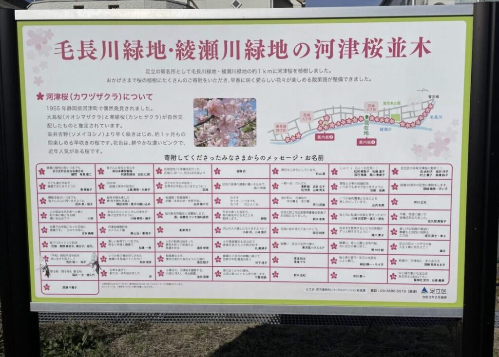 令和3年からオープンしている足立区の河津桜の新名所で、毛長川と綾瀬川が交わる場所にあります。