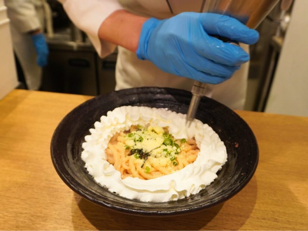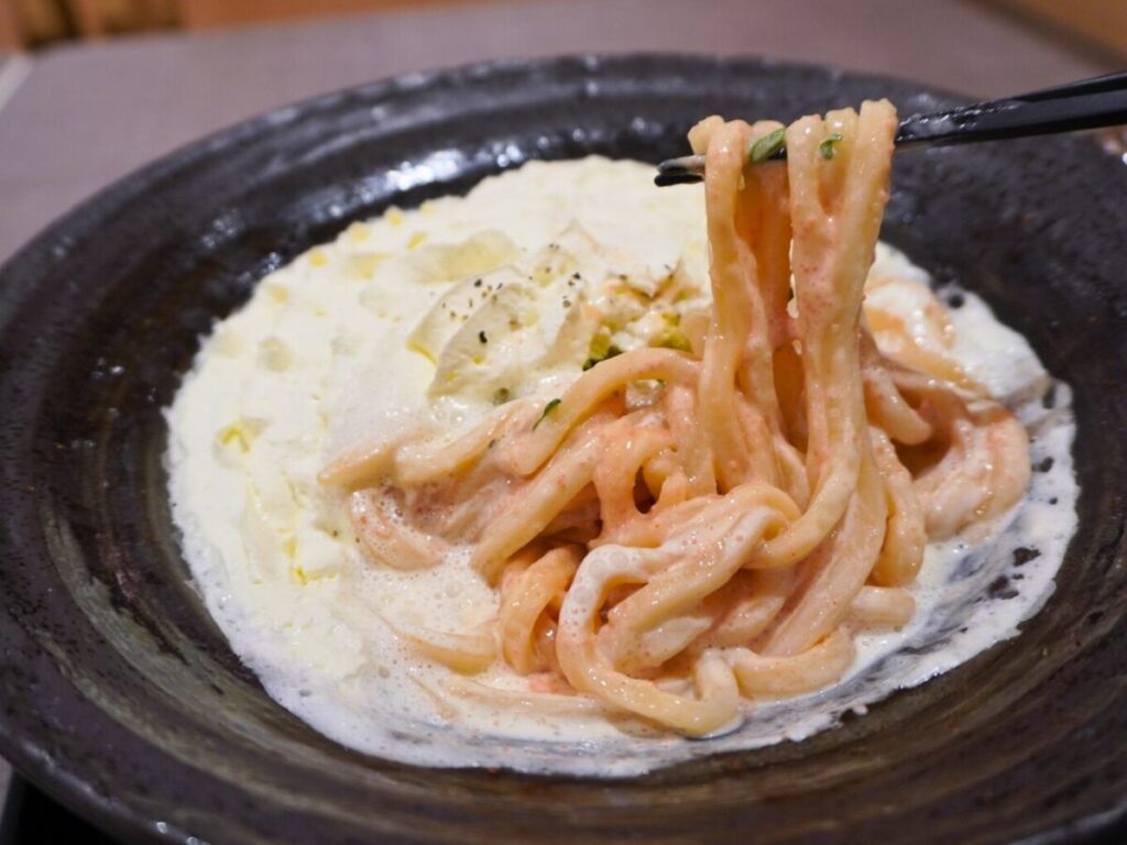 明太うどんの上に、白いホイップ状のチーズクリームがたっぷりとかかり、一見するとスイーツのような見た目です。思わず写真を撮りたくなるインパクトがあります。