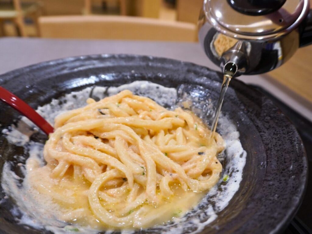 美味しい食べ方の説明がありました。まずは、白いクリームとうどんをしっかり絡まるように混ぜます。
