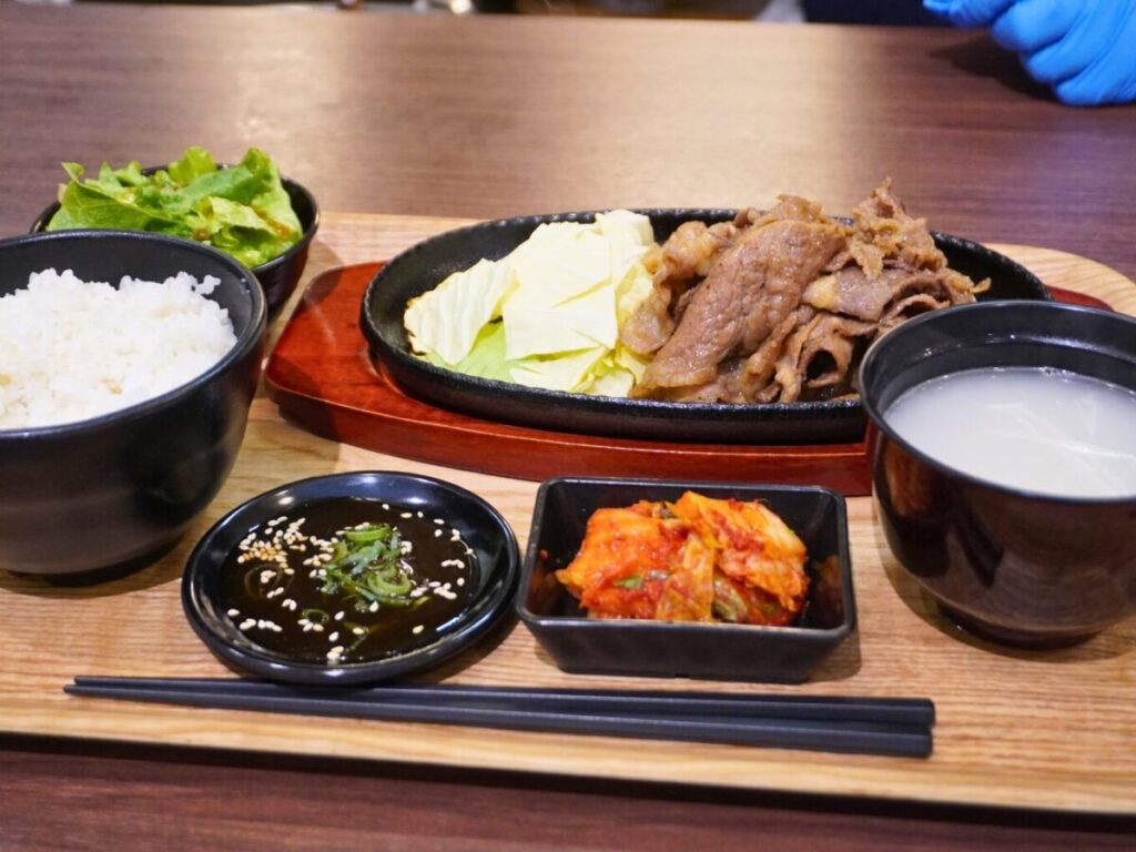 定食には、サラダ、キムチ、牛骨スープ、ご飯がセット。これだけのボリュームで1,000円(税込)という価格設定はフードコートの中でも選びやすい印象です。
