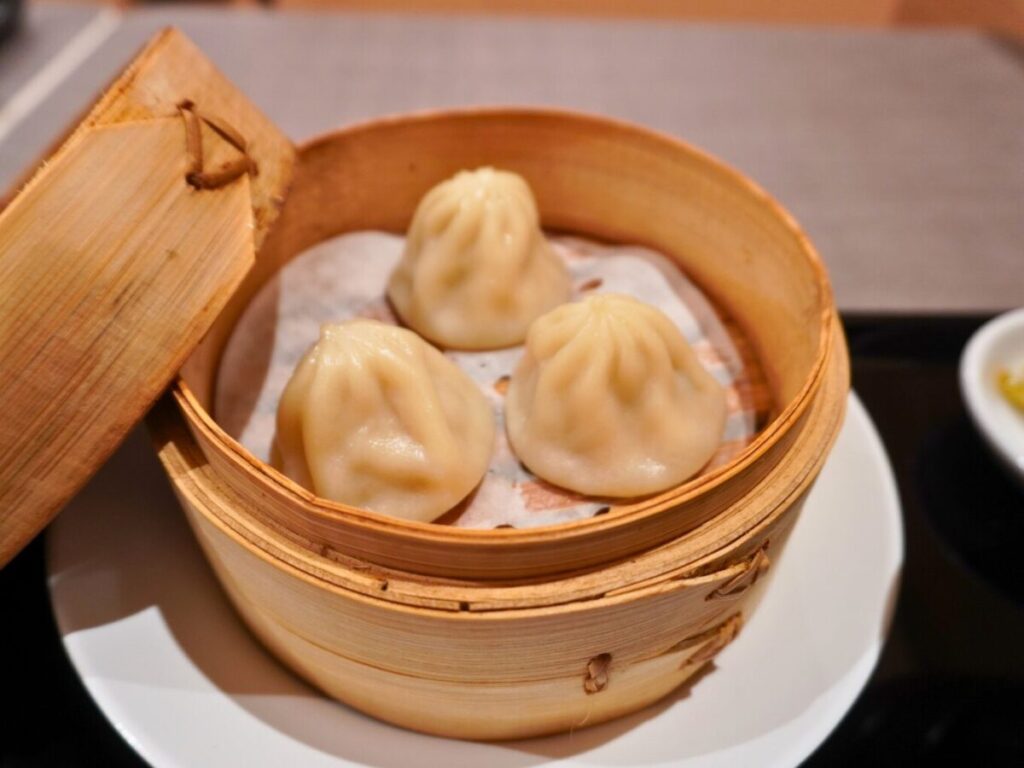 セットの小籠包は3個入り。中から肉汁が広がります。麺と小籠包の組み合わせで、台湾らしい食事の雰囲気をしっかり味わえるセットでした。