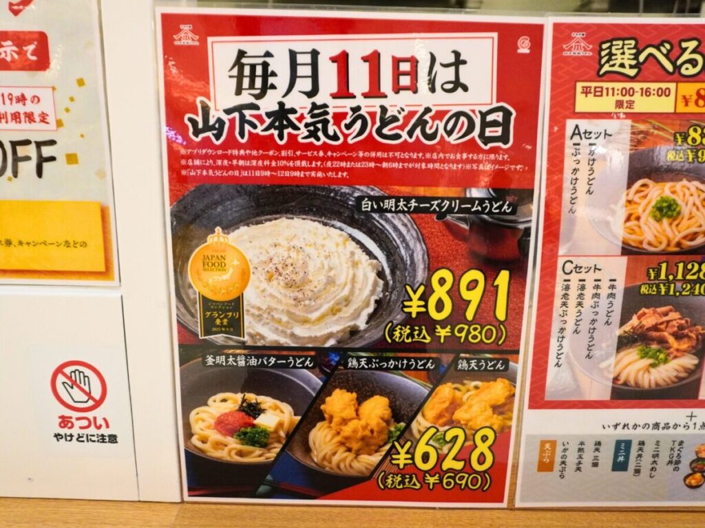 毎月11日には、白い明太チーズクリームうどんが通常1,250円のところ980円(税込)になるお得なセールを開催しています。タイミングが合えば、よりお得に味わえます。